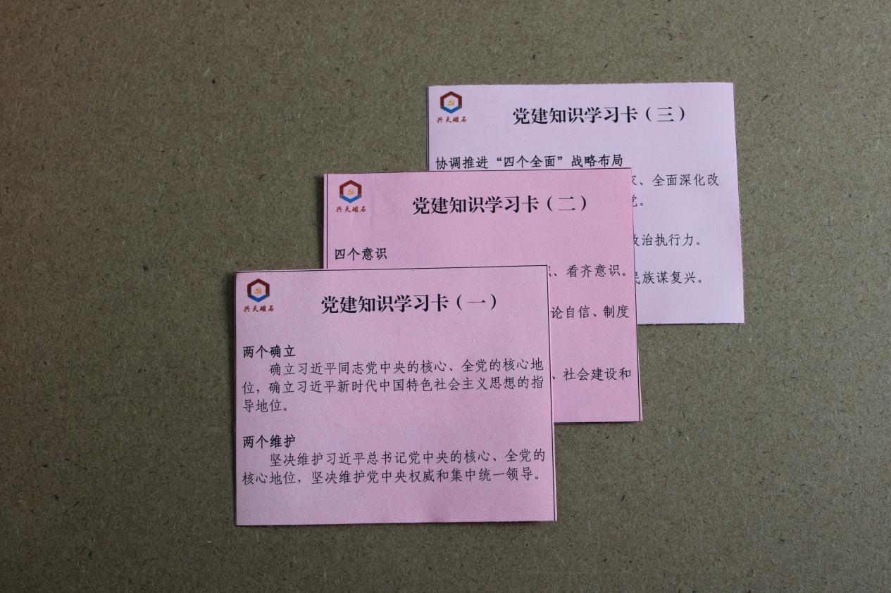 為深入學(xué)習(xí)貫徹習(xí)近平新時(shí)代中國特色社會(huì)主義思想,進(jìn)一步深化理論學(xué)習(xí),興天礦業(yè)黨支部積極創(chuàng)新形式,設(shè)計(jì)并印發(fā)“黨建知識(shí)學(xué)習(xí)卡”,切實(shí)提升學(xué)習(xí)實(shí)效。