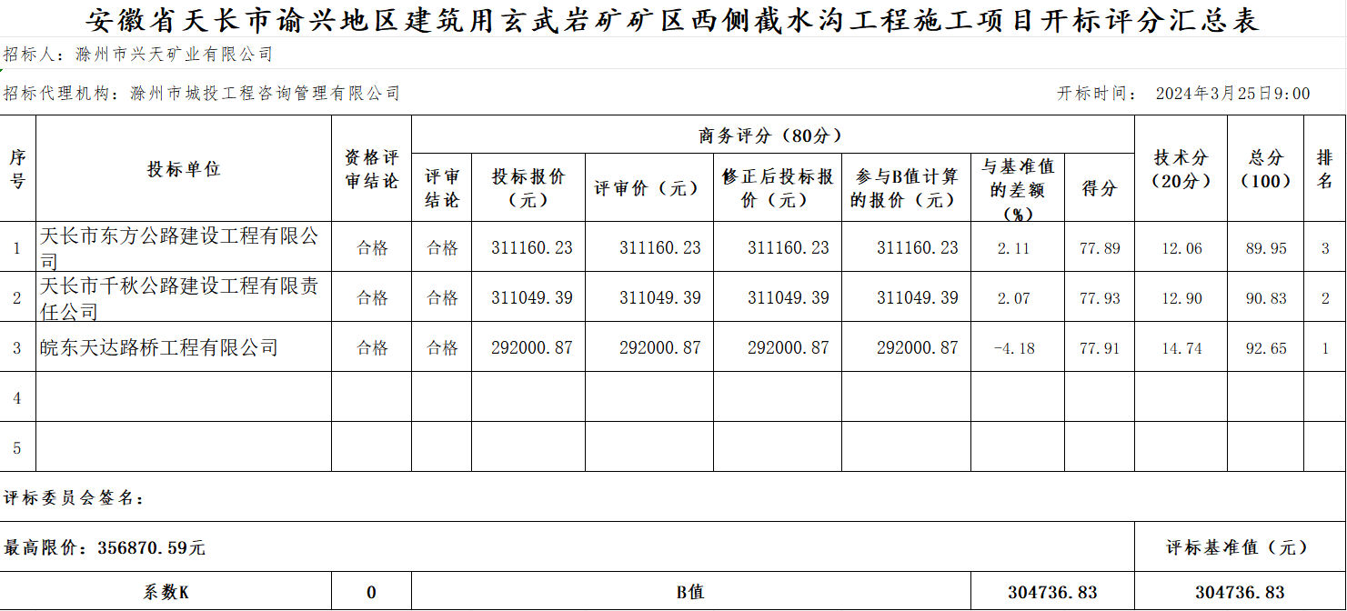 安徽省天長市諭興地區(qū)建筑用玄武巖礦礦區(qū)西側(cè)截水溝工程施工項目中標(biāo)候選人公示