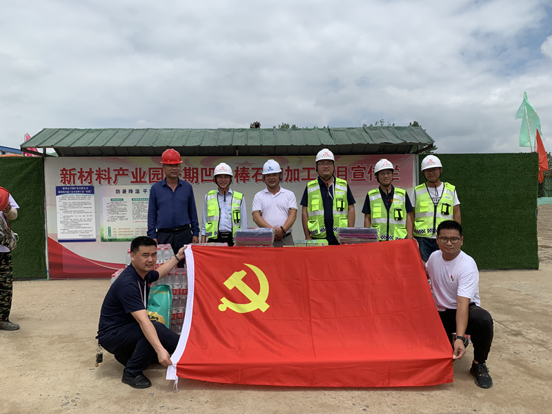 送清涼。6月22日,黨支部書記魏金龍帶領黨員志愿者到凹凸棒加工廠項目部、玄武巖加工廠項目部、環(huán)山道路項目部,為施工一線的黨員職工送去礦泉水、綠豆、西瓜、藿香正氣水等防暑降溫物資。