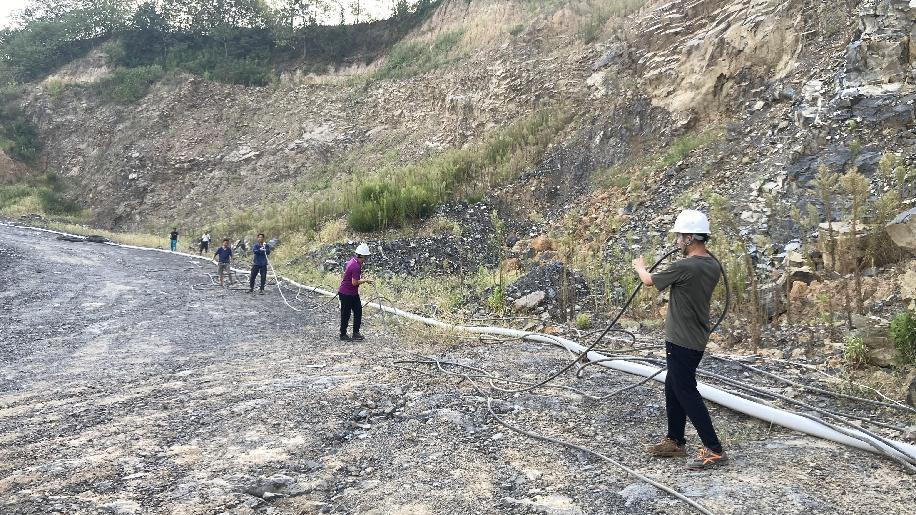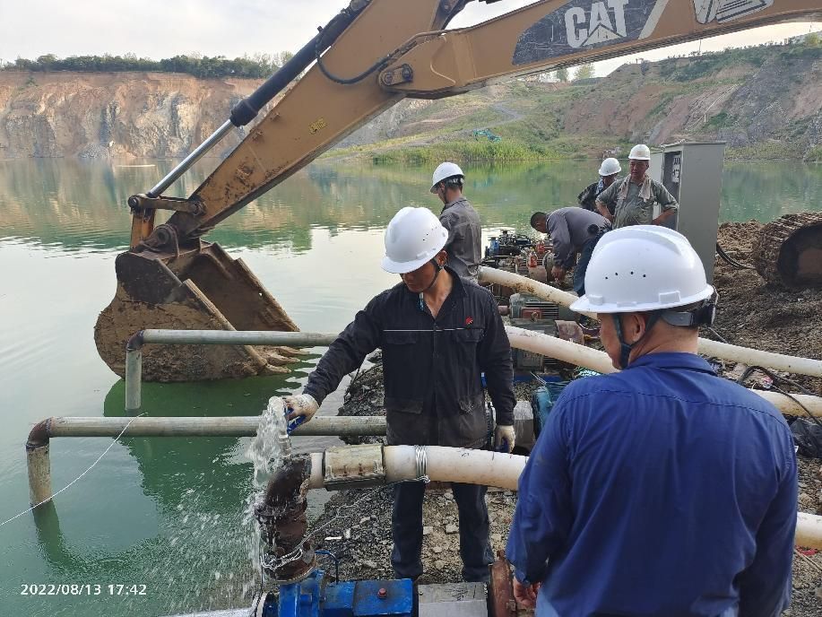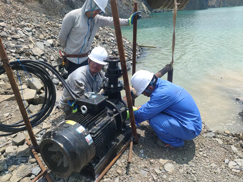 抗旱方案有了,可是要想把水從70米深的礦坑內(nèi)抽到地面,不但需要揚程特別高的水泵,還需要高規(guī)格長距離的水管和電纜,還有很多配套零部件要采購。旱情就是命令,抗旱就是責(zé)任,興天礦業(yè)副總經(jīng)理趙崗牽頭落實抗旱物資采購,親自指揮設(shè)備調(diào)運安裝,帶領(lǐng)公司抗旱突擊隊和社區(qū)干部深入礦坑,一起研究水泵需要多大功率安裝在什么地方、水管需要多粗從哪里下放、電纜需要多長從哪里接電等問題。方案制定好了,老百姓的水稻不能等,挖掘機第一時間進場整理場地,興天礦業(yè)和社區(qū)準(zhǔn)備的水泵、水管電纜等也迅速到位,抗旱突擊隊與社區(qū)干部群眾一起與時間賽跑,從早到晚緊張施工,一心想著的就是早點把水抽上去,盡量把旱情影響降到最低。