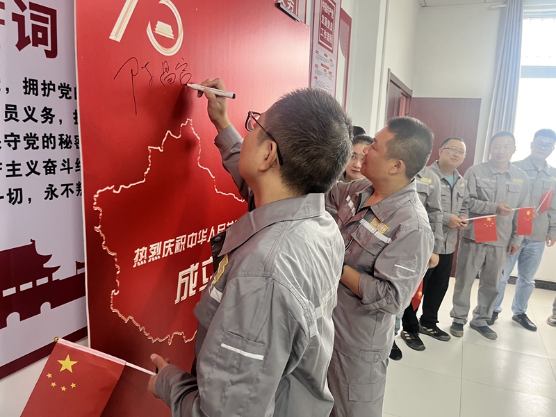 在公司黨員活動室內(nèi),公司總經(jīng)理陳昌富帶領(lǐng)全體職工合唱歌曲“歌唱祖國”,全體人員懷著對黨、對祖國的滿腔熱忱在簽到墻上鄭重的簽上自己的名字;公司職工在馬塘湖礦各裝車點、磅房等多處插上了鮮艷的五星紅旗。雄壯嘹亮的歌聲是對祖國未來的無限憧憬,整齊有力的簽名是對祖國深深的祝福和崇高的敬意,飄揚的五星紅旗表達(dá)了對偉大祖國真摯的自豪和驕傲。